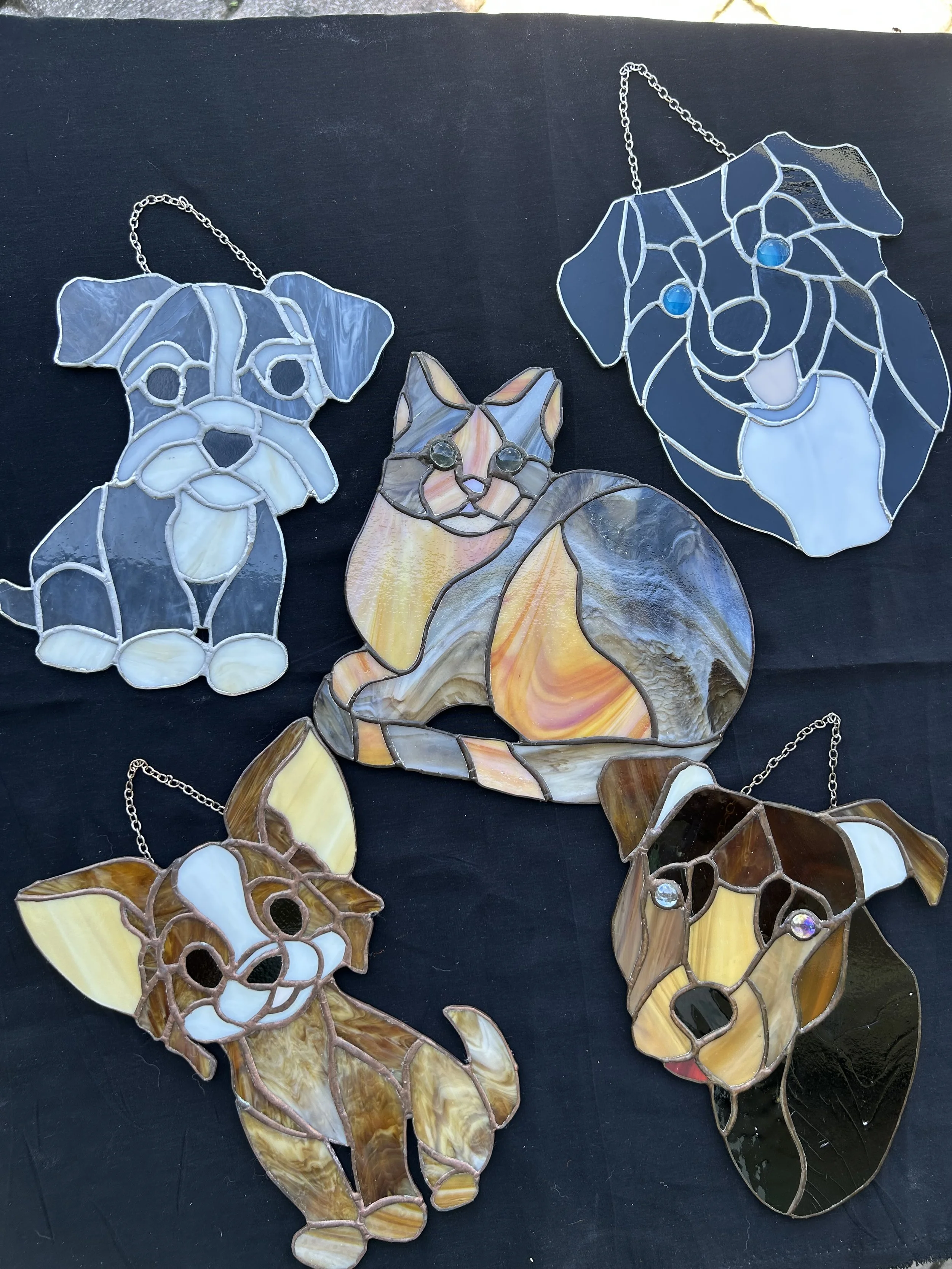 Categories: All Candy Kesser Sylvia Ford Decor Hand Painted Jewelry Stained Glass Tailor Made Wine Corkers All / Stained Glass Wolf $80.00 Customized Stained Glass Pets $50.00 Stained Glass Eagle $120.00